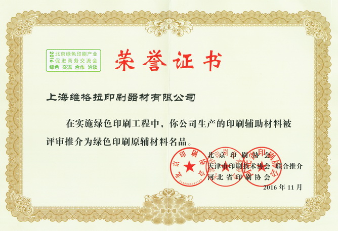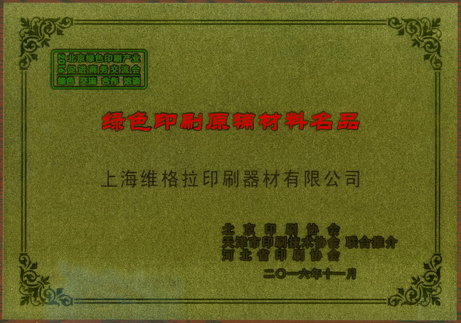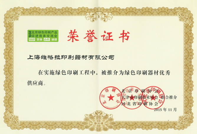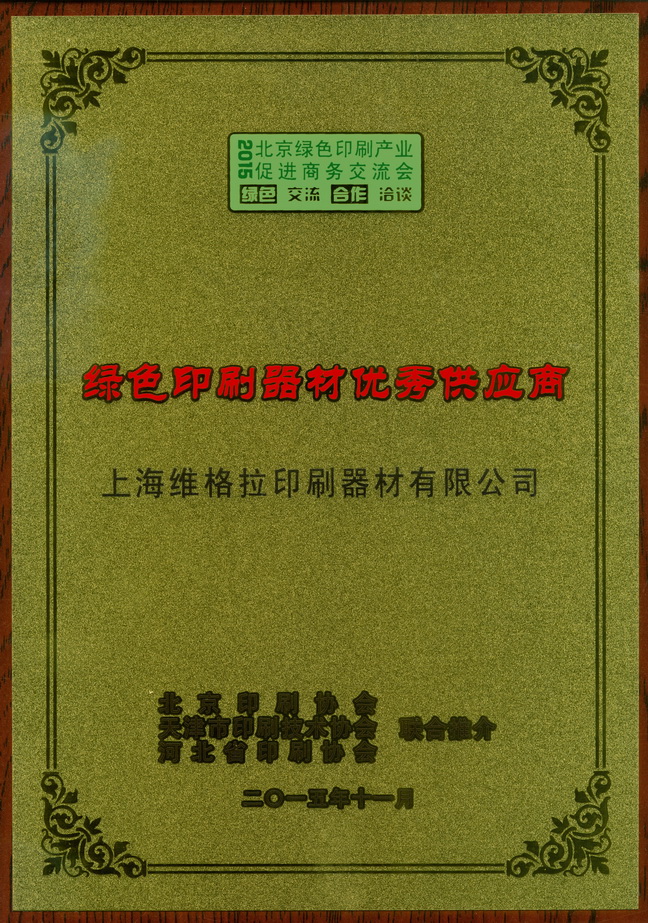 上海维格拉印刷器材有限公司积极参与北京印刷协会组织的绿色印刷原辅材料名品推介活动,及时准确的将相应产品材料提交至北京印协。我司所提交材料的完整性、合规性等得到了北京印刷协会领导以及评审专家的一致认可。使我司连续两年获得“绿色印刷器材优秀供应商”称号。