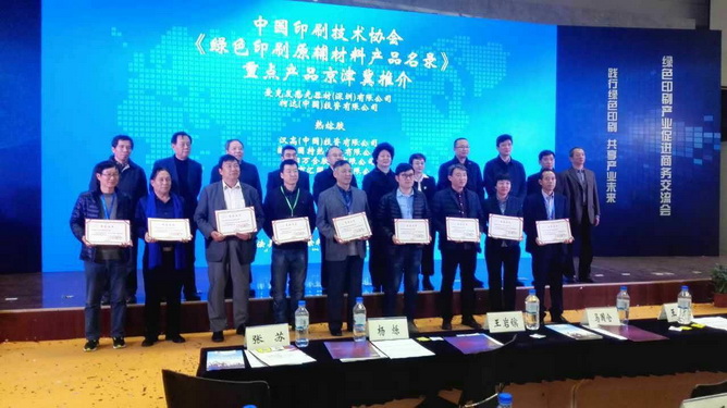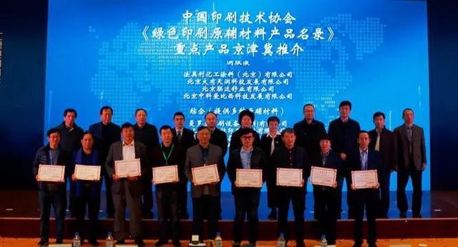 同日下午,实施绿色印刷优秀单位表彰及绿色印刷原辅材料名品推介的颁奖仪式在北京绿色印刷产业促进商务交流会上举行。共有来自京津冀地区的15家绿色印刷优秀出版单位和16家绿色印刷优秀印刷单位获得表彰,19家行业供应商被推介为绿色印刷原辅材料名品供应商。国家新闻出版广电总局印刷发行司司长王岩镔、副巡视员董伊薇、印刷处处长路洲、北京市新闻出版广电局副局长张苏、印刷发行处处长李国荣、中国新闻出版传媒集团有限公司副总经理冯军、中国印刷技术协会常务副理事长梁成林、北京印刷协会理事长任玉成等领导分别为获奖单位及供应商颁奖。绿色印刷原辅材料名品推介活动已经在北京绿色印刷产业促进商务交流会上开展了四届,为使工作更加扎实,北京印刷协会与必胜印刷网作为承办单位,总结了前几届的经验,制定了千分制的申报、评审方案,进行了广泛的宣传和征集。推介的原辅材料确定为:油墨、版材、润版液、热熔胶和洗车水五大类,并且大规模地向印刷企业征询这些材料的使用反映。经过三个月的工作,有三十余家企业递交了申报材料。京津冀三地印刷协会和联合组织各家印刷认证咨询机构及在京的业内专家对申报材料进行了认真的评议,最终评出分数超过600 分的材料供应商。绿色印刷原辅材料名品即作为中国印刷技术协会《绿色印刷原辅材料产品名录》重点产品在京津冀地区推介。